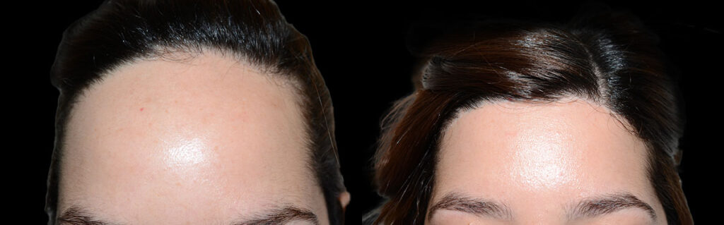 Before and 4 months after hairline lowering surgery and forehead bone rasping on this 28 year old patient. During this procedure she also had her forehead/frontal bone filed down for a less prominent appearance.