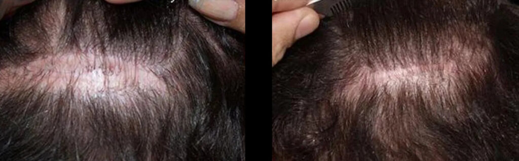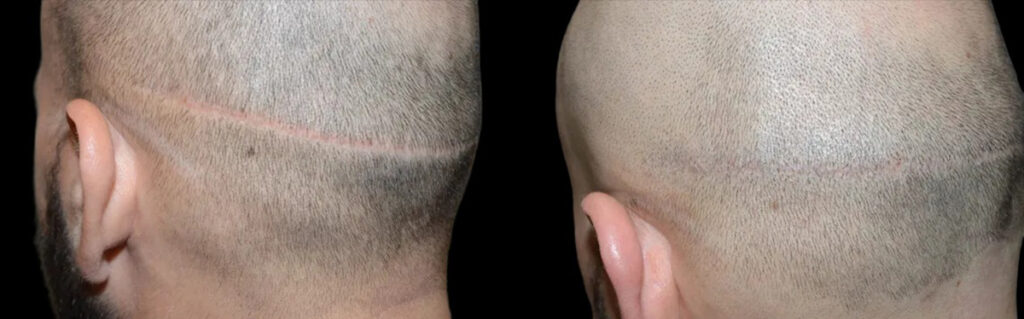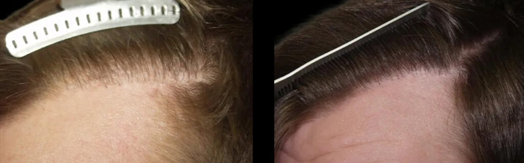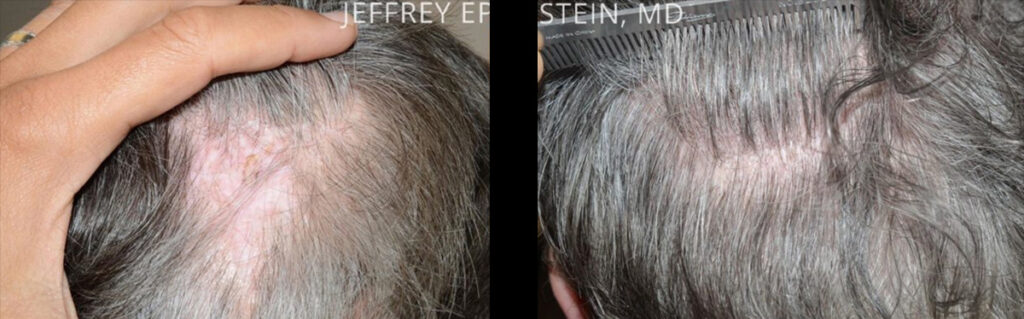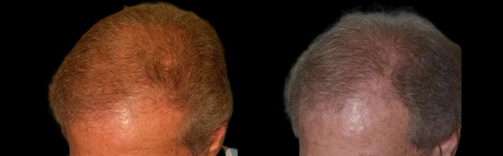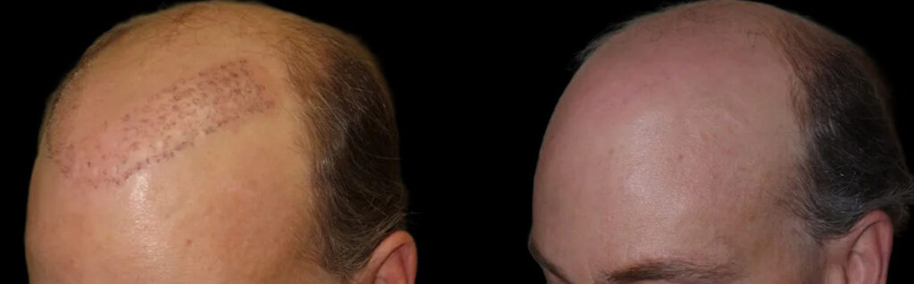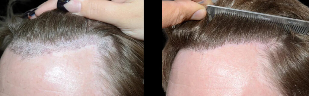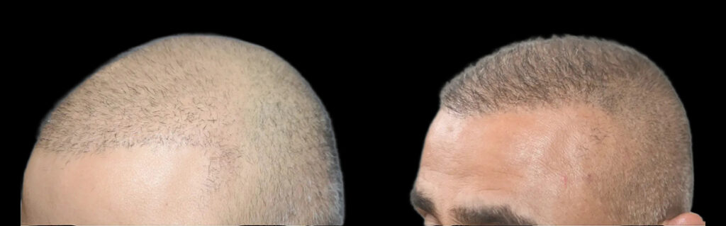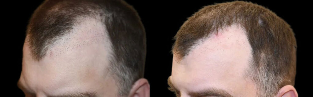 Before and after 1100 FUE grafts on this 29 year old patient. He desired reinforcing of his thinning hairline.