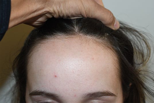Before and 3 weeks after hairline lowering/forehead reduction surgery on this 31 year old patient.