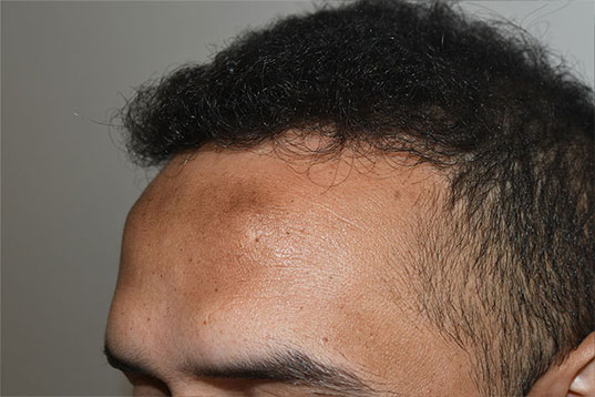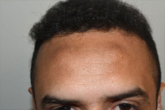 Before and 1 month after hairline lowering/forehead reduction surgery combined with forehead (frontal) bone rasping on this 39 year old patient. He desired a lower hairline as well as a reduction in the bony prominence of his forehead.