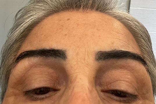 Before and after eyebrow transplant removal/excision, followed by a “heroic” eyebrow restoration to repair a prior eyebrow transplant that resulted in significant scarring. The first step was to excise completely both eyebrows, then 3 months later, she underwent a bilateral eyebrow transplant of 375 grafts per eyebrow. Final result shown at one year.
